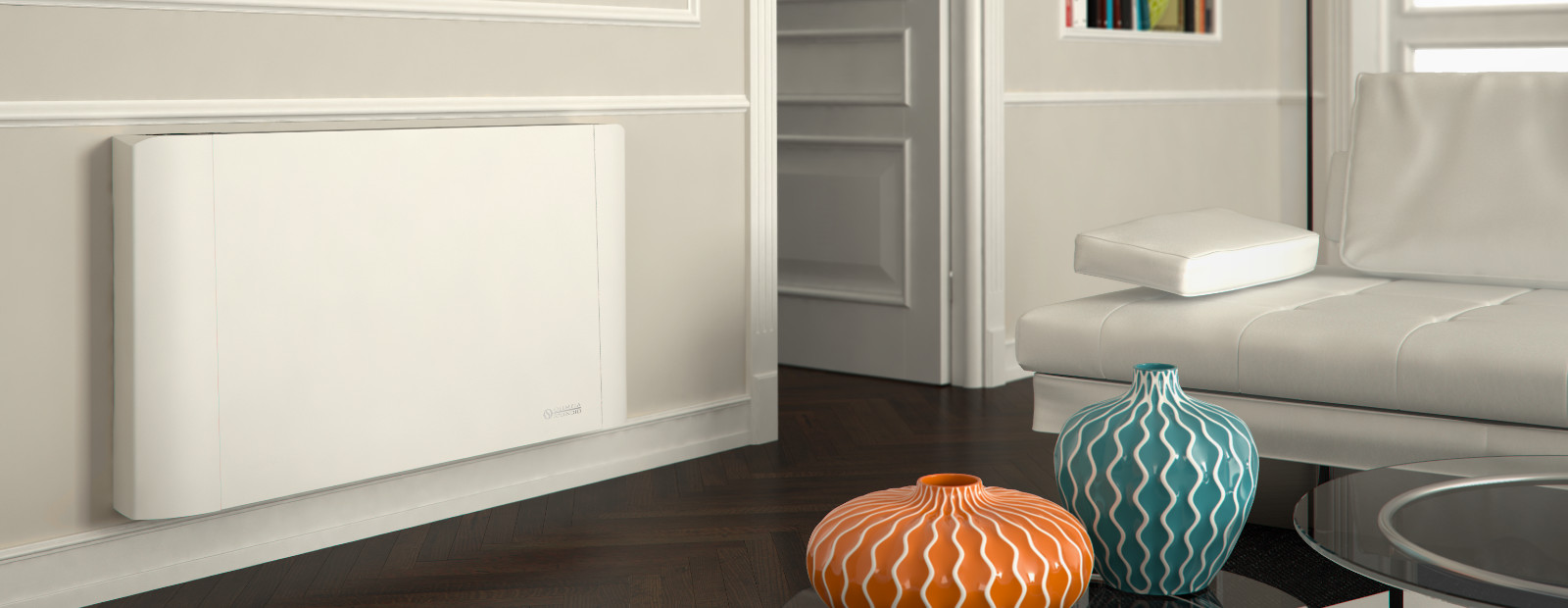El nuevo ventiloconvector ultraslim total flat en color blanco RAL 9003. La estética lineal (con el sistema de aspiración en la parte inferior) permite la máxima integración con la arquitectura del entorno. La nueva configuración con una rejilla de descarga corta y simétrica permite la instalación de mandos táctiles in situ.
